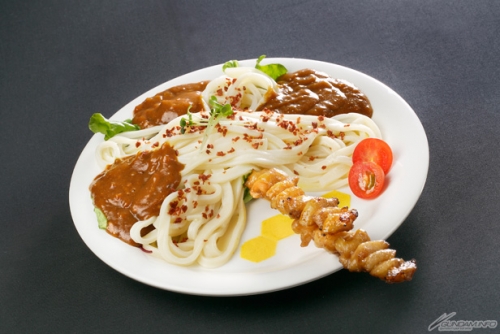 関西からの刺客、ヤサカ・マオの愛機をイメージしたプレートは、純白の装甲をイメージした「Xうどん」、「カレーソース」、そして「ハイパーサテライトぼんじり」の和風セット。