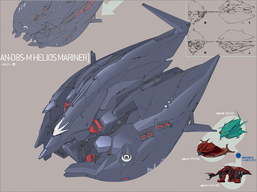 本机是火星独立吉翁军为了投入INLE夺还作战,而将预想作为「MAN-08 艾尔梅斯」后继机,所开发的新人类专用MA「MAN-08S 海里欧斯」,进行水中用改造的机体。经过改造后,达成机体气密性和各种推进器在水中的应对,左右荚舱还搭载了「电磁流体诱导推进器(MHD)」。