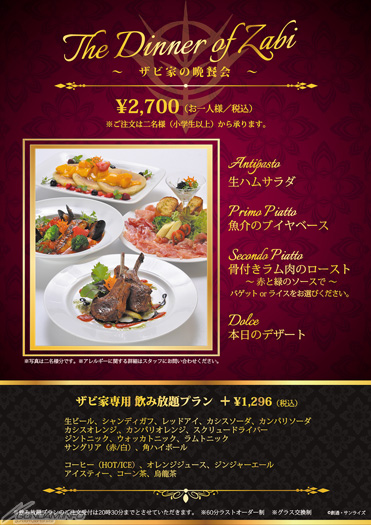 本餐点能享用重现扎比家餐桌的高级豪华全餐料理,限定17:00至21:00的晚餐时段供应。