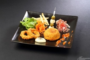 【右】会战前夜的小巷子~番茄&罗勒的米可乐饼・炸花枝圈・生火腿・橄榄和起司的串物~ 价格:1,080日圆(含税)