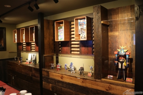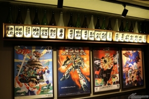 店内展示了众多的机器人动画商品、主视觉海报及取材自各作品的酒瓶!