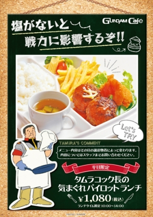 高达官方咖啡厅「GUNDAM Café 秋叶原店」,将推出以『机动战士高达』宇宙战舰白色基地内掌厨的“田村料理长”,其所做的料理为形象来设计的餐点「田村料理长的善变驾驶员午餐」,并於1月16日(二)起在平日限定菜单中登场。价格为1,080日圆(含税)。