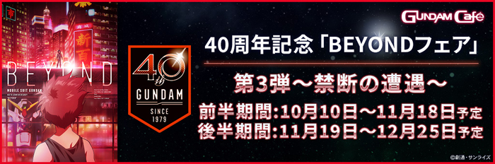 高达官方咖啡厅“GUNDAM Cafe”各门市与大阪“GUNDAM SQUARE”,从10月10日(四)起,开始举办“机动战士高达40th记念BEYOND祭典第3弹~禁忌的遭遇~前半”。