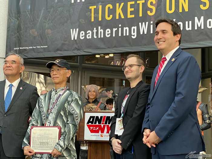 照片内为驻纽约日本大使馆大使山之内氏、ANIME NYC的彼得・塔塔拉氏、卡罗斯议员、富野总监督。