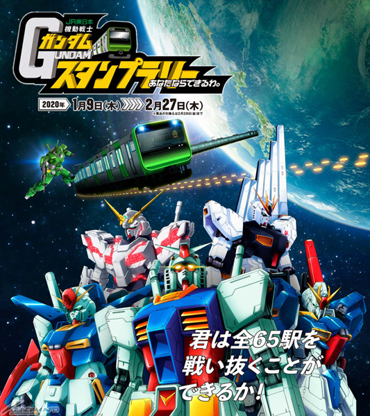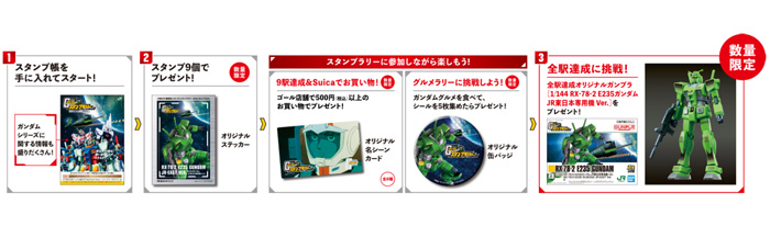 集章马拉松活动中把登场自‘机动战士高达’‘机动战士Ζ高达’等作品的人气角色化为印章,全部设置在65处车站,只要收集满即可获赠山手线E235系配色的“全车站完成独家高达模型〔1/144 RX-78-2 E235高达JR东日本专用机 Ver.〕”。