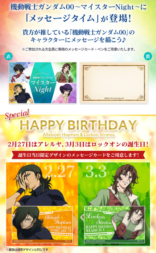 “机动战士高达00 ~尖兵Night~”将实施写下讯息给喜欢角色的“讯息时间”。此外,于举办期间中的2月27日(四)和3月3日(二)迎接生日的” 阿雷路亚·帕普提兹姆”和” 洛克昂·史特拉托斯”将会有生日限定款式的讯息卡片登场,生日当天即可获得限定款式的讯息卡片。