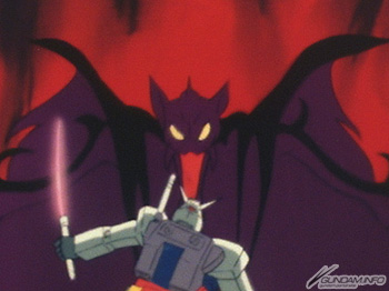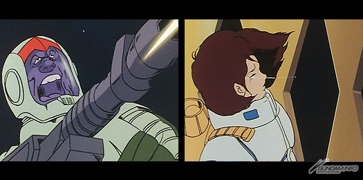 对毕格萨姆的特攻,由史列加的G战机作为守护高达的强化装甲。就在观众们以为毕格萨姆击毁G装甲战机的瞬间,从里面又冒出高达上半身的场面,混杂了英雄属性与战场特有的、「踏着己方尸体前进」的残酷性,令人哑口无言。而接着阿姆罗的台词「这样你还不倒!」以及挥舞武器的气魄更是精彩。