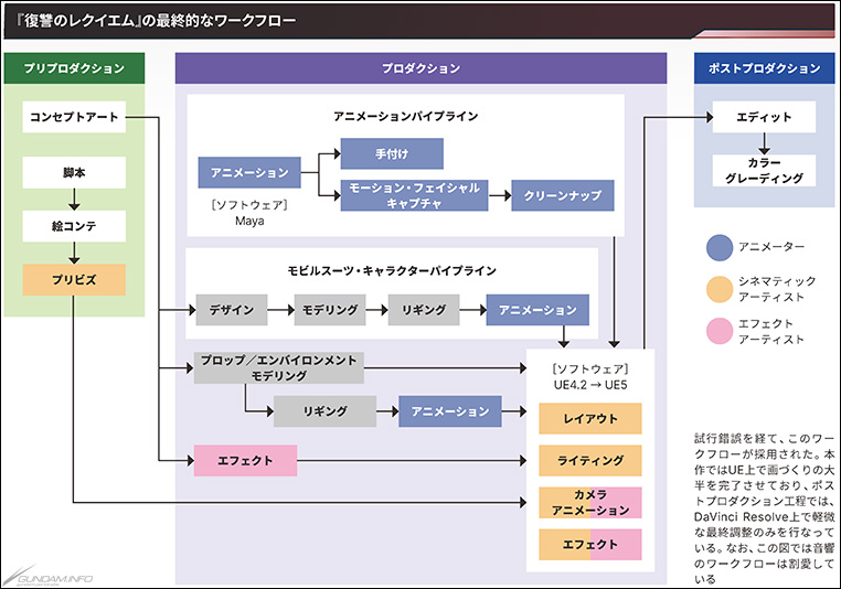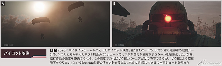 布罗斯达:与剧本制作同时进行的是由德国团队制作试播影片,并验证使用Maya和UE的工作流程,进行外观开发。由于本作品用的素材在这个阶段尚未完成,因此使用了制作中的素材以及BNF提供的‘THE ORIGIN’等现有素材、市售素材。