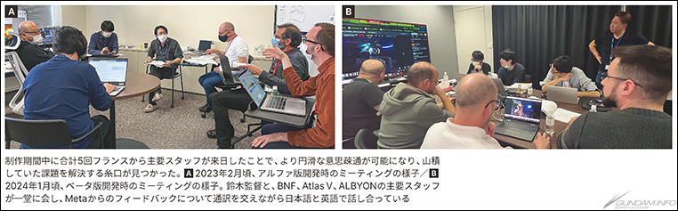 和Bandai Namco Filmworks(以下简称BNF)共同制作本作品的Atlas Ⅴ,是2017年成立专门制作沉浸式内容的巴黎制作公司。“本作品企划是2021年由BNF的小形尚弘(执行制作人)和弥富健一(制作人)向Atlas Ⅴ接洽开始的。而且事前也受到了Meta “想制作使用著名IP作品,融合叙事和互动的VR电影” 的磋商,我认为日本的‘高达’是最合适的”Atlas V的Julien Bercy(制作人)这么表示。