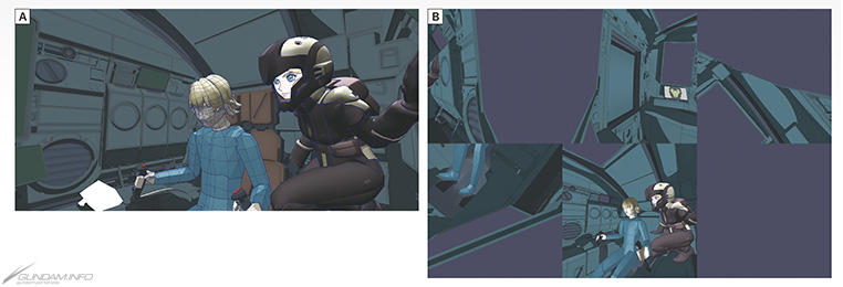 A/B:有些镜头中,角色的上半身与下半身使用不同的透视角度进行转换,并将3D分镜分开处理。画面中的蓝框表示用于作画的框架。使用VR转换器输出这些画面时,运用了AE上以相机所对准方向为中心进行透视变换的功能
