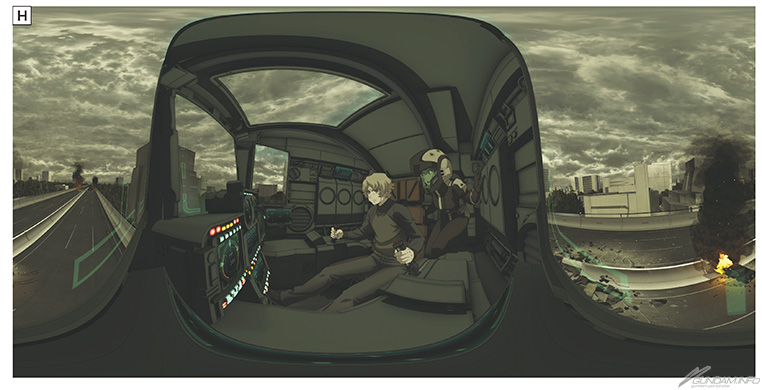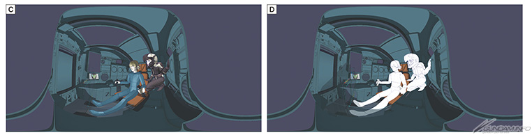 A:以分镜为基础,用3ds Max和Pencil+4制作的PreVis。Fixzi使用导览模型,Babia使用25岁的模型。Babia则在作画阶段重画成14岁。这个场景中,2人位在萨克的驾驶舱内