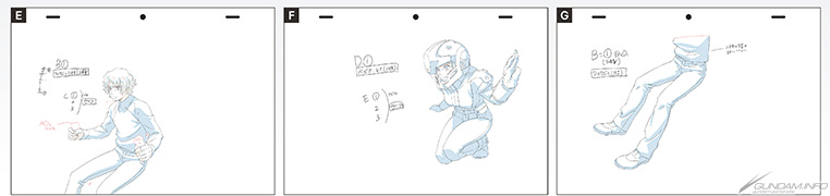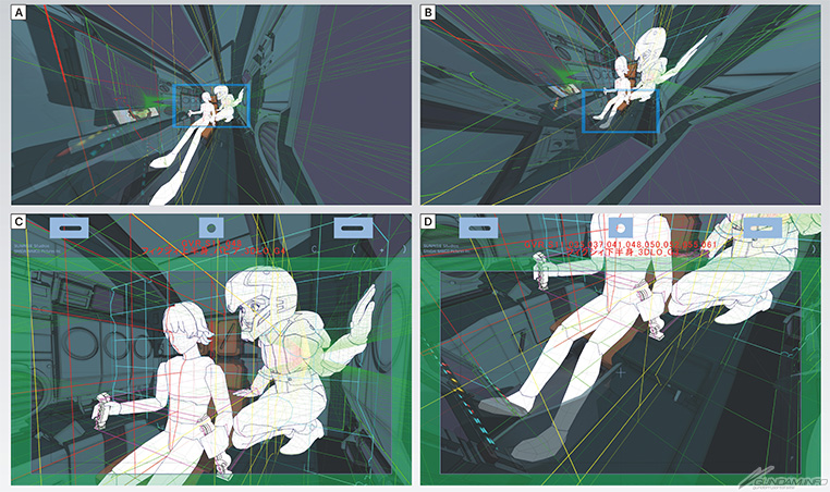 C/D:3D分镜以及E~G:基于此绘制出的部分原画。C/D中,画面以大量的网格线标示出各角色、天花板、墙壁等的透视参考。这些网格是根据作画团队的意见所增加的,他们认为“有网格的话,会更容易对齐透视”