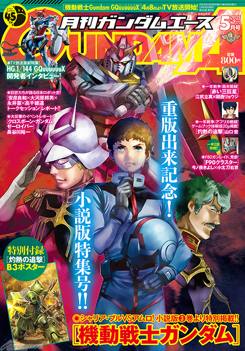 “GUNDAM A 5月号”今天发售!封面是美树本晴彦氏绘制的小说版“机动战士高达”。附录是游戏书新装版“机动战士高达0079 灼热的追击”插图外观B3海报!