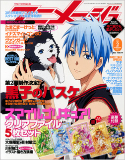 2013年的第一本ANIMAGE的封面为决定制作第2季TV系列动画的‘影子篮球员’,图案是黑子与哲也2号可爱的2合照♥ 本期特集为声优小野贤章与小野友树以黑子&火神为题的两位小野对谈,以及多田俊介导演的访谈等内容,诉说对第2期动画制作的想法与抱负。附录为正要迎向剧情高潮的‘光之美少女SMILE!’的透明资料夹豪华5枚套组。A4尺寸的光之美少女战队5人全部集结登场,只有ANIMAGE才会提供的豪华赠品♥ ‘光之美少女SMILE!’报导内由本系列导演・大冢隆史与角色设定者川村敏江进行的最终对谈绝对非看不可♪ 川村先生的插画重点教学也包含在本篇报导中☆ 特制海报则是决定以制作续集的‘K’为首,‘玉子市场’‘闪电十一人GO 时空之石’‘卡片战士!!先导者’这些强力的报导内容。‘K’当中饰演周防尊一角的声优津田健次郎的访谈以及担任狗朗一色的小野大辅先生的短评作为作品回顾。‘玉子市场’则是提供图书礼券让参加者通通有奖♥