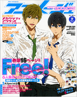 正 值夏天! Animage 9月号的封面是‘Free!‐Eternal Summer‐’的遥&真琴这对好朋友组合♥ 原画是担任角色设计的西屋太志☆ 肌肤上紧贴湿透的衬衫,2人可真是所谓“会滴出水的男孩”状态☆ 他们加上渚・怜・凛・宗介等4人,6人版本的插画是内封长型海报喔。而且这次的全员申购企划,就是使用这张插画的图书卡喔。附录也是‘Free!‐ Eternal Summer‐’,A4透明资料夹的豪华3枚组。刊头特集是高达16页的大份量,‘Free!’的粉丝绝对不容错过喔♪