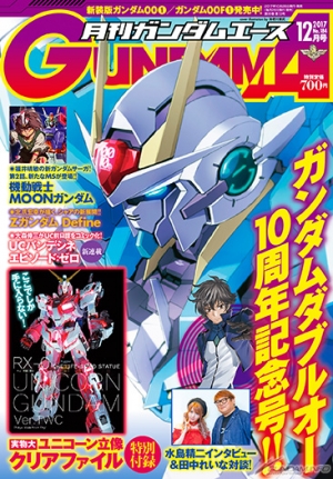 月刊GUNDAM ACE 12月号,为了纪念实体大独角兽高达立像盛大开幕特别附送特制透明资料夹,还有刊登纪念『机动战士高达00』10周年的水岛精二监督访问&对谈,请不要错过罗。