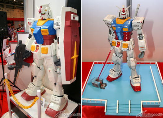肩甲上印有高达模型30周年LOGO的「HY2M 1/12 高达」(照片左),和7月在东静冈站前广场设置的实物大立像「RG 1/1 RX-78-2 高达」的模型。(照片右)