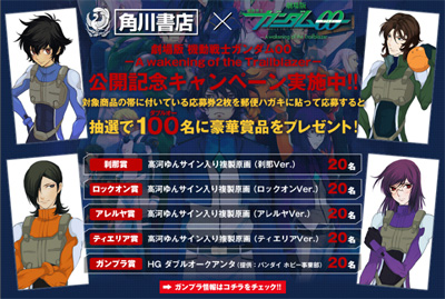 抽奖活动是为了纪念在9月18日(六)即将公开的“剧场版 机动战士00 -A wakening of the Trailblazer-”而举办,收集角川集团所发行的高达00关连的指定书籍书腰上所附赠的应募卷2张寄出参加应募,即有机会可抽中高河弓老师的高达驾驶员复制原画(含签名)、最新高达模型“HG 1/144 量子型00”等豪华奖品,合计共计100名可以得到奖品。应募截止日期为10月31日(日),当