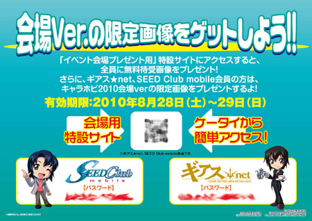 | 内容 | ■“袖珍型会员卡(纸扇型)”免费发送 以会员卡连结特别设置的网站,即可下载以下图案 ・免费待机画面 ・TANE CHARA手机图像(“煌(队员polo衫 白ver)”) ・CHIBI GEASS手机图像(“黄昏之间”※背景图像) ※手机图像TANE CHARA图像、CHIBI GEASS图像为各会员限定的服务。 ※卡片数量有限。展览期间如果达到预定发送数量时,即结束赠送。 ■“活动会场限定图像”抢先赠送 限定TANE CHARA图像为‘阿斯兰[学院制服]’、限定CHIBI GEASS图像为‘鲁鲁修(执事)’ ※限定图像的赠送以各会员为服务对象。当天加入会员也OK。 ※限定图像的索取方法,请参考以下说明。 【1】从会场专区内的告示板上的2维条形码,连结到特别设置的网站,并输入告示板上所写的密码。 【2】索取与告示板相同内容的A6大小的广告传单。(传单可找工作人员索取) 【3】由工作人员直接提供赠送。(直接领取时,请将自己的【My设定】的页面打开,交给工作人员) |