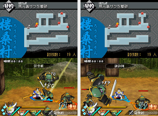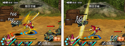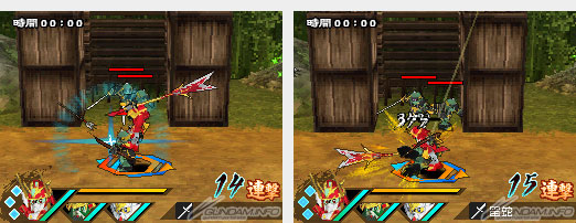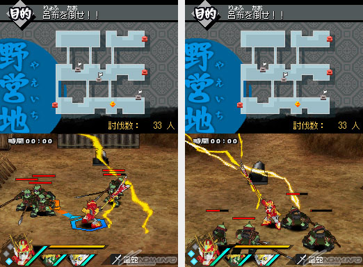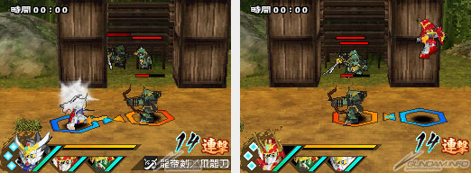 任务最多可有3人武将组成一对挑战。 战斗中可以用L钮切换出撃中的武将,因应战况或是敌人的属性有效率攻略关卡。