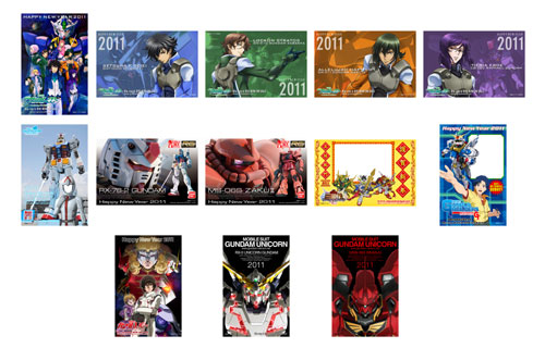 高达模型30周年纪念品牌“RG(Real Grade)”系列外盒、可与“RG1/1高达立像”一起合影留念的图样,以及‘机动战士高达UC’、‘剧场版 高达00’等全13种图样发售。 将2010年的回忆和2011年的开始,使用高达贺年卡寄出吧!