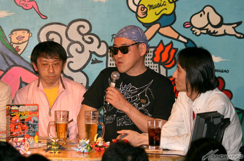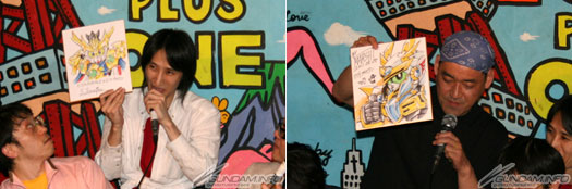 从左开始为司仪的尾上一先生等,BANDAI HOBBY事业部长谷川先生、菅沼久义先生、アミノテツロ导演、横井孝二老师、今石进老师、寺岛慎也先生。尾上先生为参与前些日子发售的「SD高达大全集骑士高达篇」(ASCII・MEDIAWORKS刊物)SD高达骑士。
