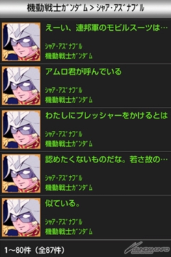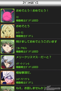 以‘机动战士高达’为首,从高达系列8部作品中集合100位以上的人气角色,能够享受2,000句以上作品中的名台词以及只有在这才听得到的原创语音等内容。下载的语音也可以作为来电铃声及闹铃声来使用。尽情享受这些大量的语音吧!